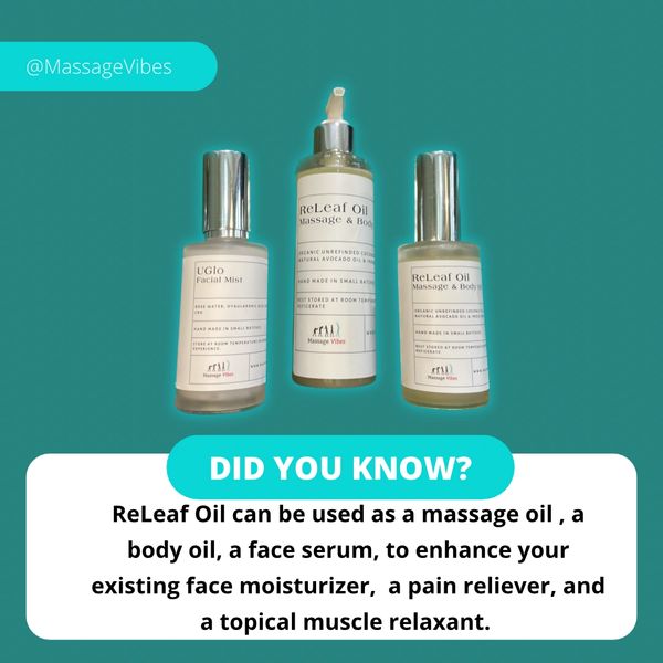 ReLeaf Oil by MV is full of healing benefits for your body, skin, connective tissue, ligaments, tendons, and even your bones, so do not rinse off the oil..let your skin drink in all of its benefits.